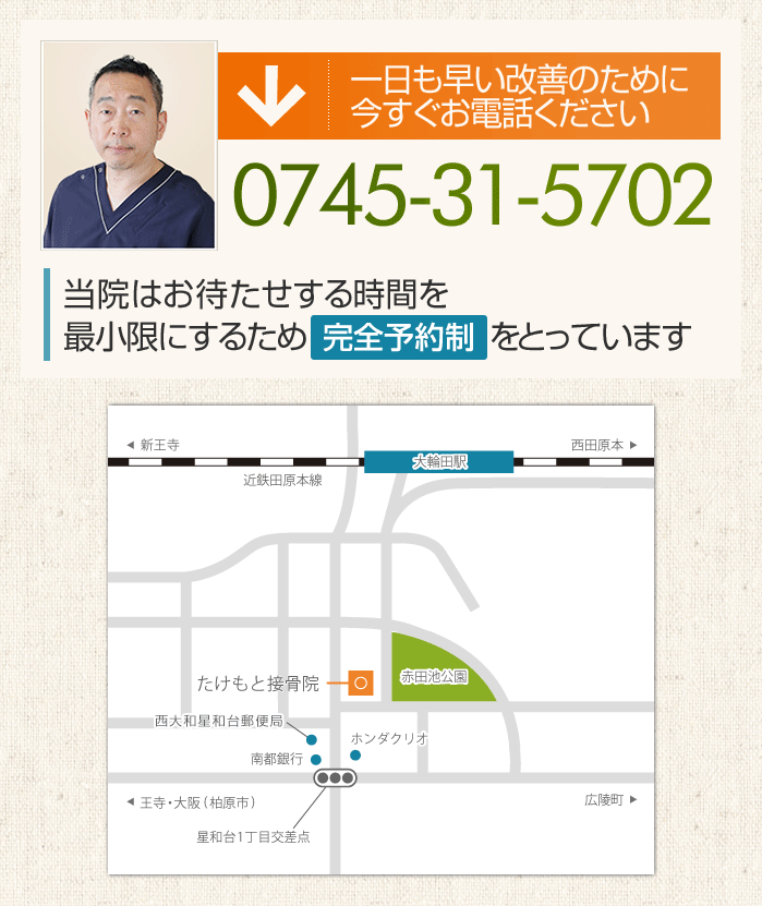 奈良県北葛城郡河合町にある、たけもと接骨院・整体院を開業しお陰様で奈良はもとより大阪や他府県の皆様に延べ10万回以上の施術実績でお役にたつことができました。